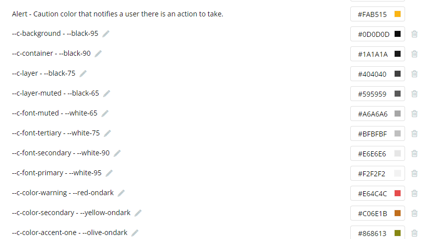 In the Styles > Style variables tab, create a set of variables and assign them colors from your primary palette. You can choose any colors at this stage (since they will be overwritten later). Still, the default colors will be visible in the editor, so it's worth assigning them values that reflect reality for your convenience.