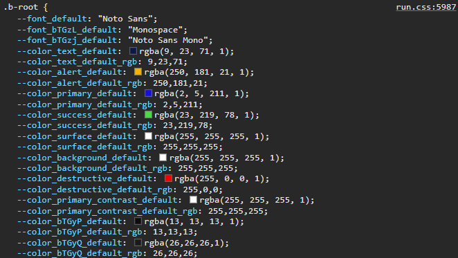 Launch the main page of your app (index) in a browser, then open the DevTools extension. In the Elements panel, highlight the main <html> tag. In the Styles panel, please find the list of all color variables (likely saved in the b-root class), then copy and paste it into any text editor.