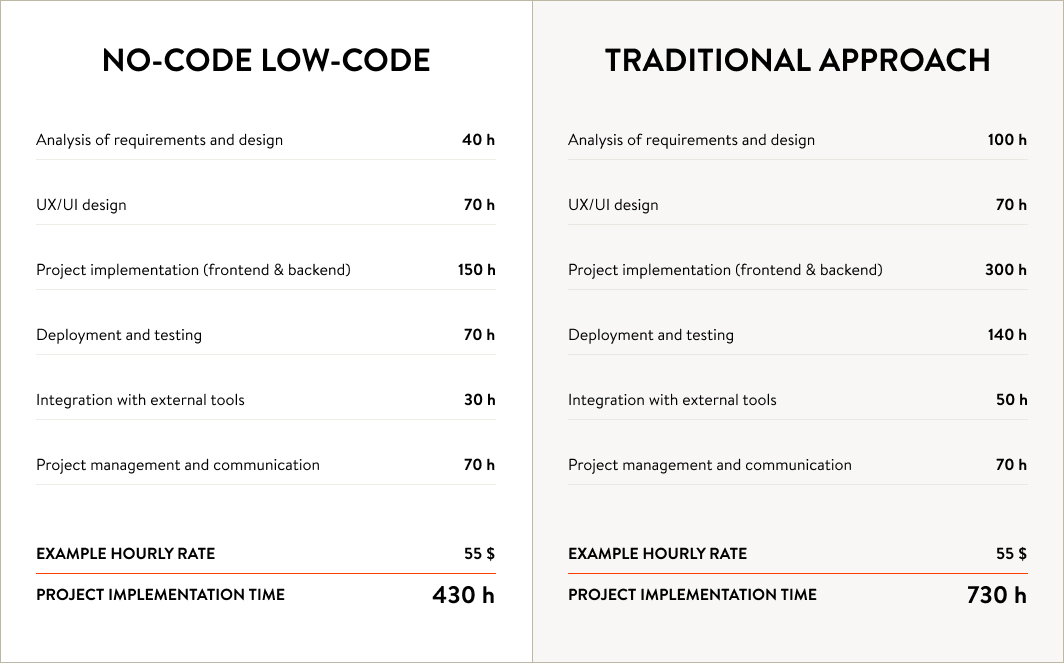 Analyzing the pros and cons, we will rely on market data and our own years of experience. Let's start by examining the most popular asset of LCNC, namely the speed we gain compared to traditional programming.