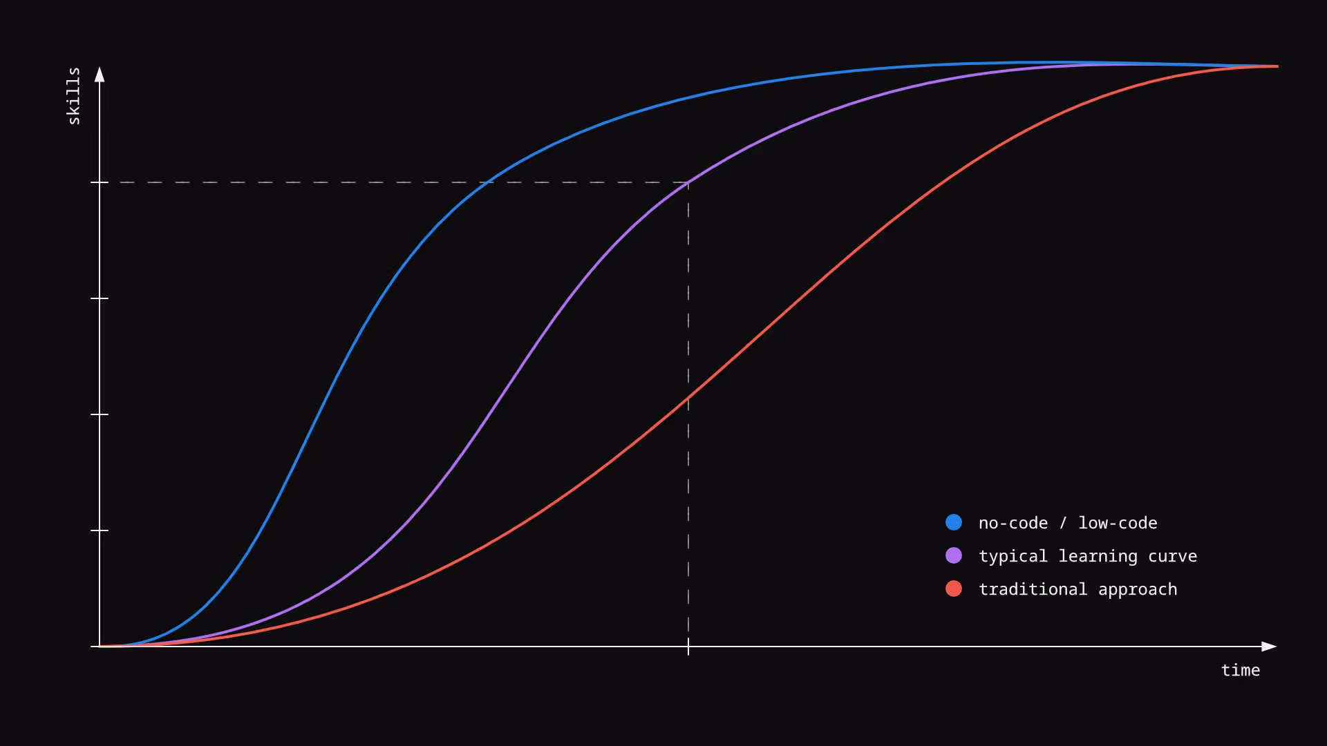 There's a theory that the time needed to delve into a given field of knowledge by 80% (at the level of a school grade of "B" or "good enough") is the same as that necessary to go from 80% to 100%. In the case of traditional programming methods, the graph is slightly shifted to the right. Learning the basic concepts (variables, loops, functions) can take considerable time if you have not had any contact with any programming language before. However, further learning becomes much easier after crossing a certain threshold of knowledge because the basics are common to most contemporary programming languages.