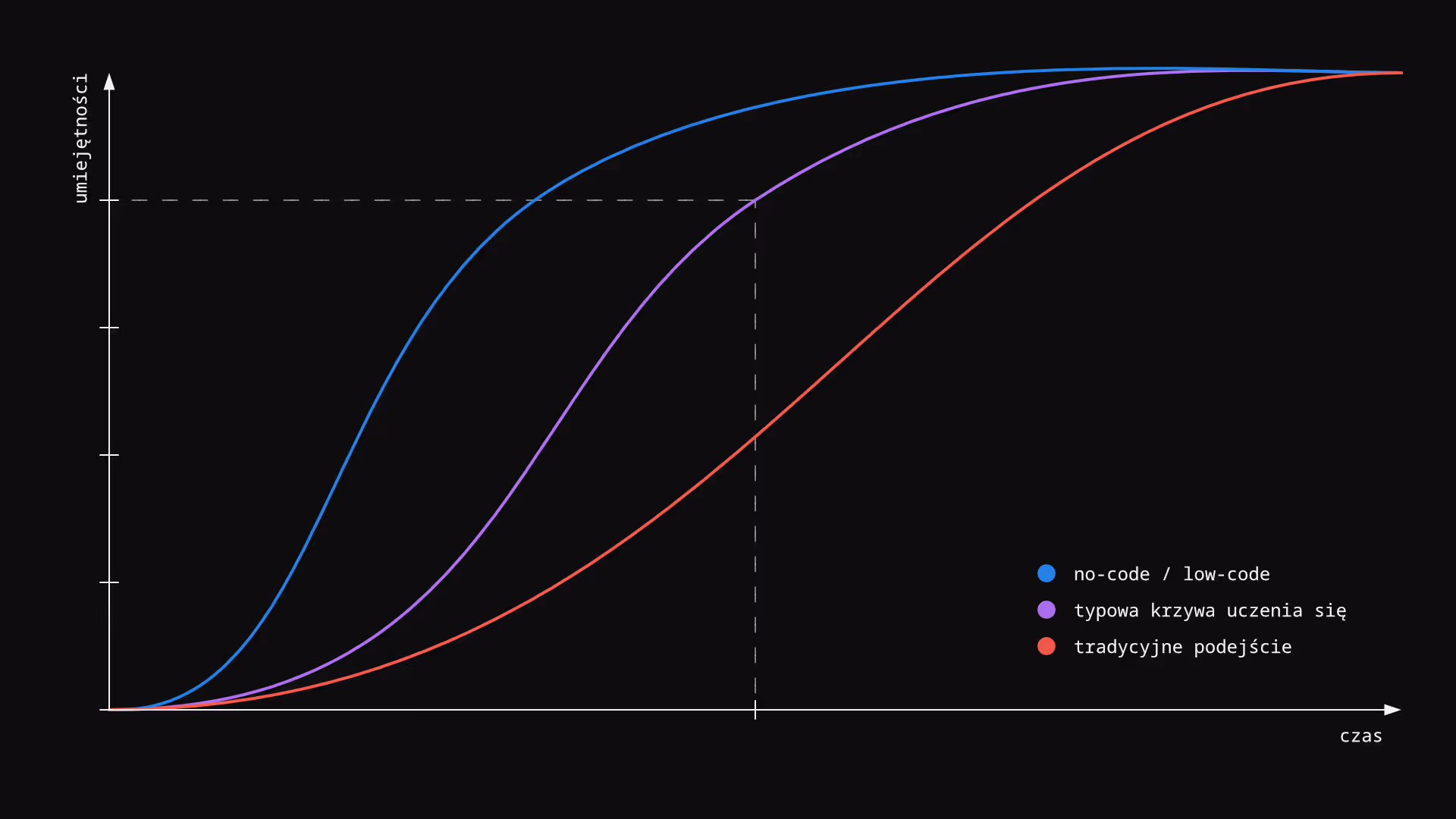 Istnieje teoria, według której czas potrzebny na zgłębienie danej dziedziny wiedzy w 80% (na poziomie szkolnej oceny "4", albo "wystarczająco dobrym") jest taki sam, jak ten niezbędny na przejście od 80% do 100%. W przypadku tradycyjnych metod programowania wykres jest lekko przesunięty w prawo. Jeśli do tej pory nie miałeś/-aś styczności z żadnym językiem programowania to poznanie podstawowych pojęć (zmienne, pętle, funkcje) może zająć sporo czasu. Po przekroczeniu pewnego progu wiedzy dalsza nauka jest już jednak znacznie łatwiejsza, ponieważ podstawy są wspólne dla większości współczesnych języków programowania.