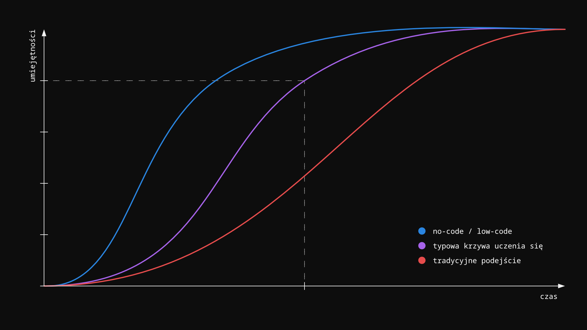 Istnieje teoria, według której czas potrzebny na zgłębienie danej dziedziny wiedzy w 80% (na poziomie szkolnej oceny "4", albo "wystarczająco dobrym") jest taki sam, jak ten niezbędny na przejście od 80% do 100%. W przypadku tradycyjnych metod programowania wykres jest lekko przesunięty w prawo. Jeśli do tej pory nie miałeś/-aś styczności z żadnym językiem programowania to poznanie podstawowych pojęć (zmienne, pętle, funkcje) może zająć sporo czasu. Po przekroczeniu pewnego progu wiedzy dalsza nauka jest już jednak znacznie łatwiejsza, ponieważ podstawy są wspólne dla większości współczesnych języków programowania.