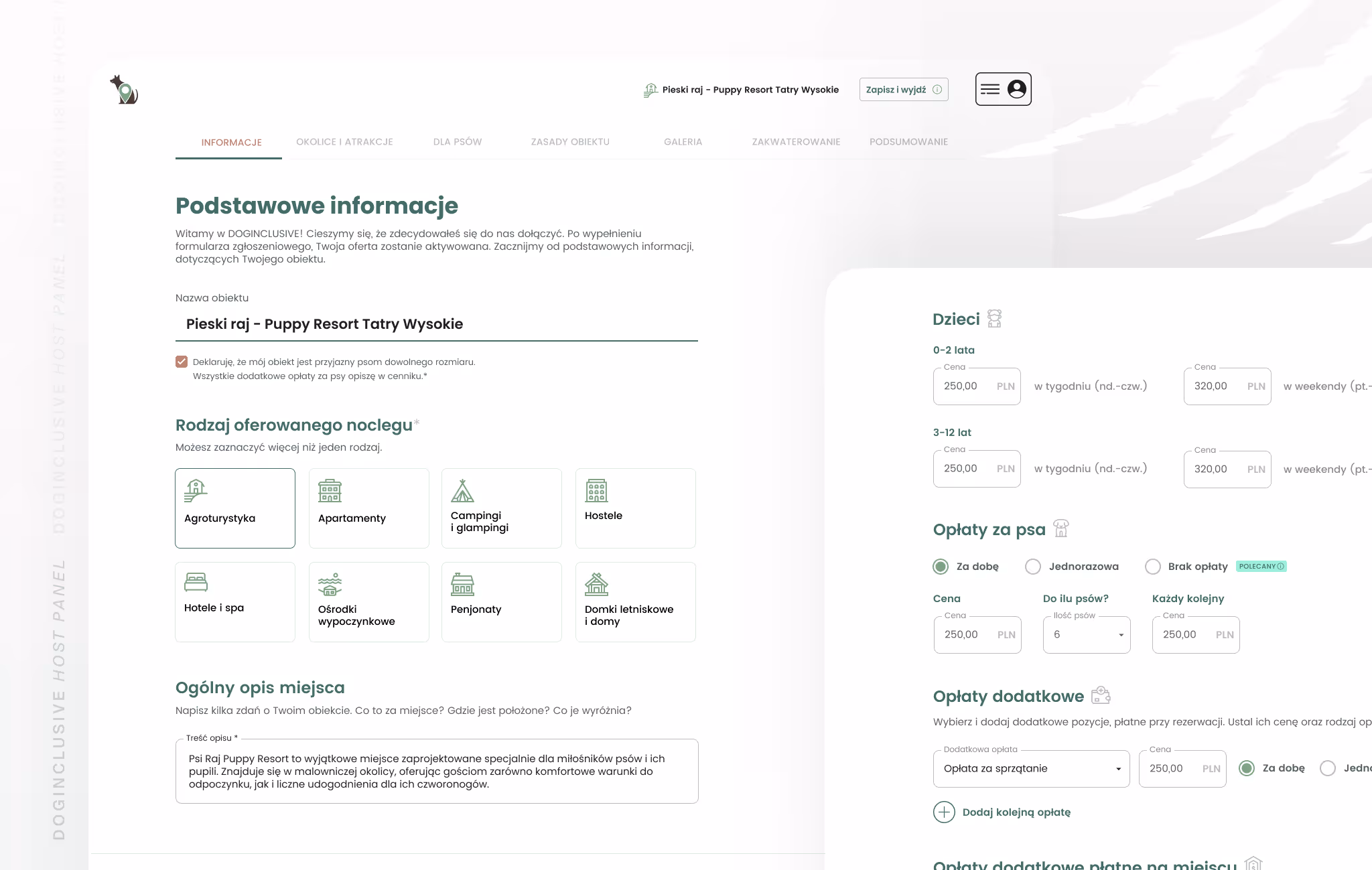 Stworzenie intuicyjnego systemu umożliwiającego gospodarzom tworzenie ofert i pełne zarządzanie nimi na platformie DogInclusive. W ten sposób właściciele obiektów mogą łatwo edytować ich opisy i cenniki, ustalać terminy dostępności w kalendarzach, dodawać zdjęcia oraz zarządzać rezerwacjami, a także komunikować się z gośćmi.