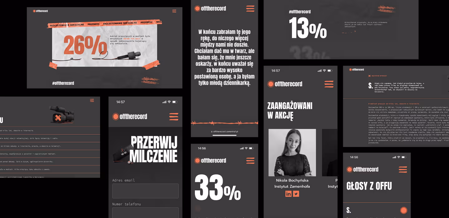 Mobbing i przemoc na tle seksualnym w miejscu pracy to zjawisko, które wciąż jest codziennością wielu polskich kobiet. Problem zdecydował się naświetlić Instytut Zamenhofa w raporcie noszącym tytuł Offtherecord: molestowanie seksualne dziennikarek w Polsce. Wraz z fundacją Tech To The Rescue mieliśmy zaszczyt wesprzeć Instytut w działaniach mających na celu zwiększenie świadomości przemocy seksualnej w polskich mediach. Zakres prac po stronie havenocode obejmował ogólną koncepcję graficzną oraz projekt i wdrożenie strony internetowej, na której można było pobrać raport w formie pliku pdf oraz przeczytać relacje dziennikarek, które padły ofiarą przemocy seksualnej lub były jej świadkiem. Głównym celem platformy było zwiększenie zasięgu raportu, ułatwienie dyskusji oraz zaangażowanie opinii społecznej w poszukiwanie rozwiązań problemu molestowania seksualnego w branży mediów.