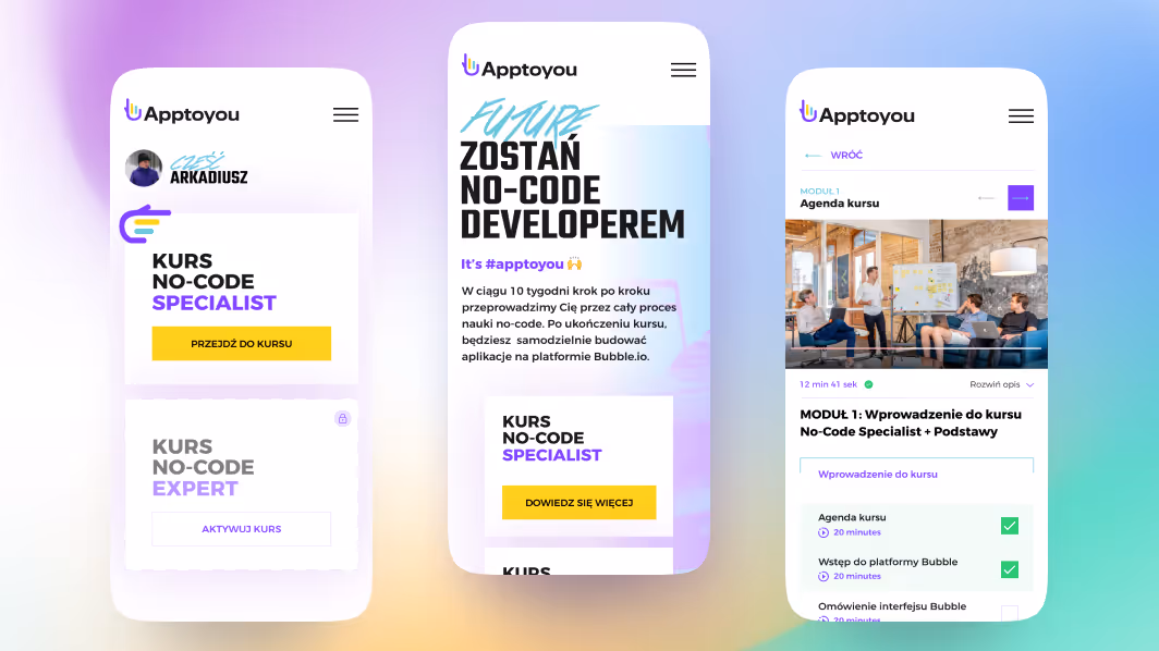 Apptoyou był dla nas projektem ważnym i z wielu powodów wyjątkowym. Dla wszystkich osób sceptycznie nastawionych do no-code stanowi dowód, jak uniwersalna jest to platforma i jak szeroki jest wachlarz oferowanych przez nią możliwości. Dla osób chcących wejść do świata programowania bez pisania kodu - jest namacalnym przykładem tego, jak szybko można zacząć przygodę z tworzeniem swoich własnych aplikacji. Dla nas natomiast, jest potwierdzeniem jakości stworzonych przez nas kursów, a także ogromnej wartości merytorycznej wiedzy, którą nasz CTO Kamil Tarczyński dzieli się z innymi.